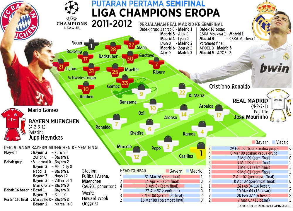 Ronaldo, yang membukukan 41 gol di La Liga, bakal menjadi amunisi utama Madrid. Menarik untuk dilihat, bagaimana Bayern bakal meredam pemain termahal dunia itu. ”Kami memanfaatkan gol-gol Ronaldo. Tidak ada batas pada kemampuannya,” ujar Marcelo, bek kiri Madrid.